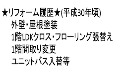 | 特色 | リフォーム履歴あり(H30年頃)、前面道路4.1、駐車2台、都市ガス、対面式キッチン、スーパー6分、コンビニ5分 |
