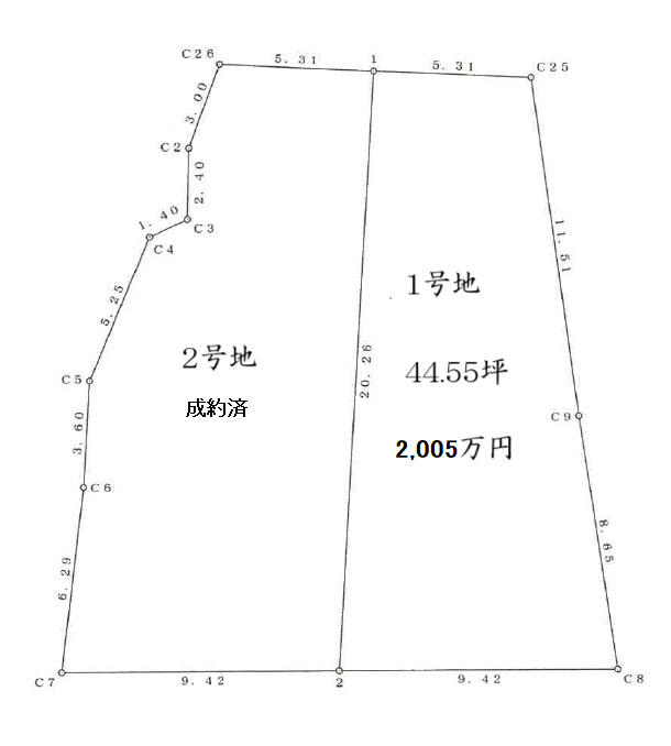 居住用土地83.82坪、建築条件無、前面道路2.6m 小学校8分、スーパー8分、コンビニ3分 |