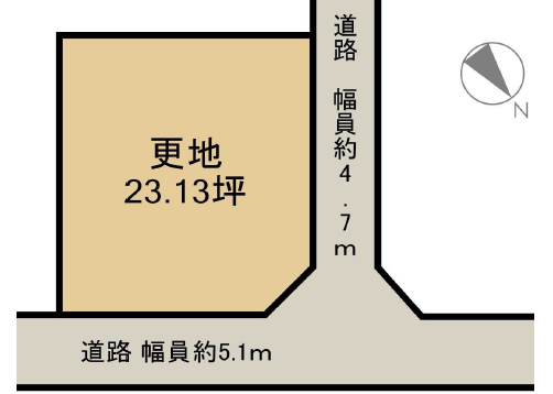 居住用土地23.13坪、建築条件無、角地、前面道路5.1m、都市ガス、上下水道引込済 小学校5分、スーパー6分、コンビニ3分 |