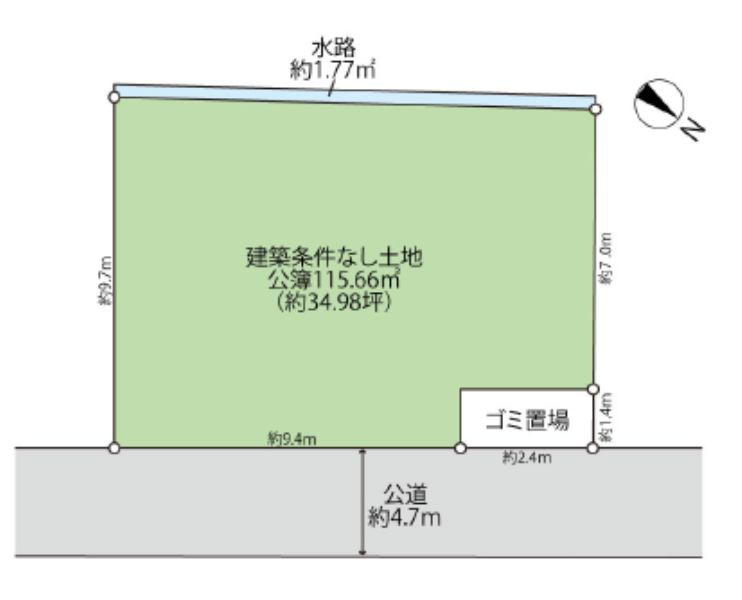 居住用土地34.98坪、前面道路4.7m、都市ガス 小学校9分、スーパー11分、コンビニ6分 |