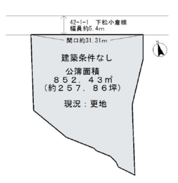 居住用土地、事業用土地257.86坪、建築条件無、前面道路5.4m、都市ガス、上下水道引込済 小学校9分、スーパー14分、コンビニ7分 |