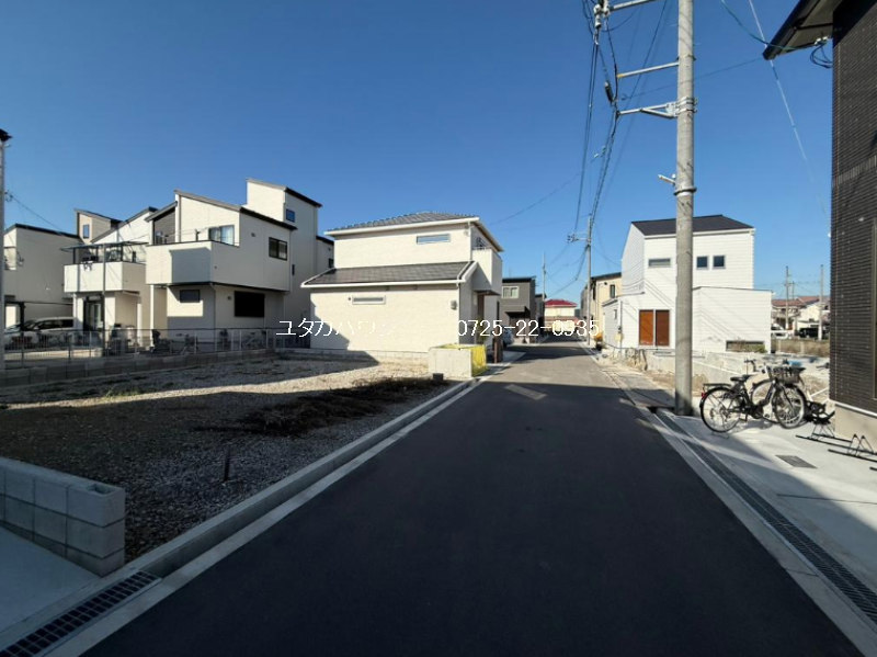 | 居住用土地41.74坪、建築条件無、角地、前面道路4.1m、都市ガス、上下水道引込済、小学校1分、スーパー8分、コンビニ3分 |