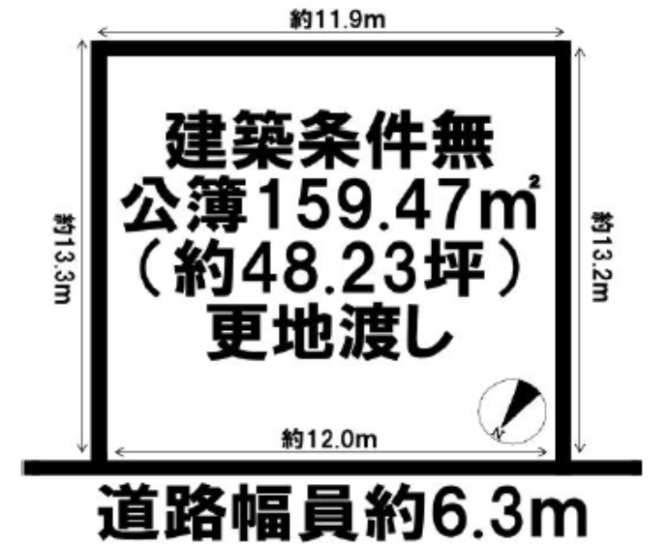 居住用土地48.23坪、建築条件無、前面道路6m、都市ガス、上下水道引込済 小学校13分、コンビニ5分 |