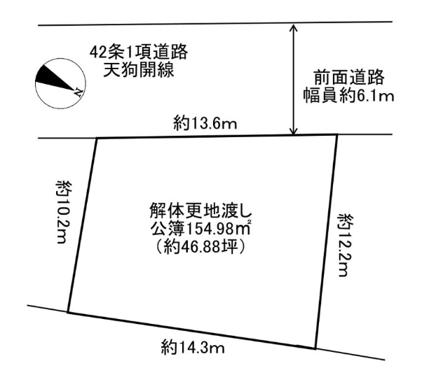 居住用土地46.88坪、建築条件無、前面道路6.1m、都市ガス 小学校2分、スーパー11分、コンビニ4分 |