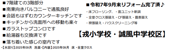 全面リフォーム、カウンターキッチ 、コンビニ1分、スーパー11分、小学校7分 |
